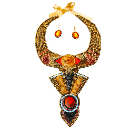 Gold Bead Collar Necklace Set with Long Bib Drop Featuring Swirled Stone Detail