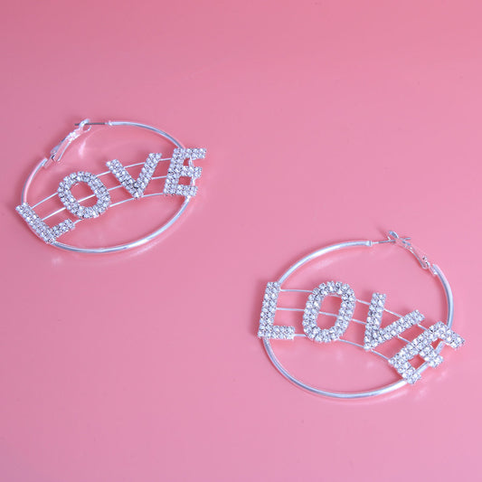 Rhinestone LOVE Silver Hoops