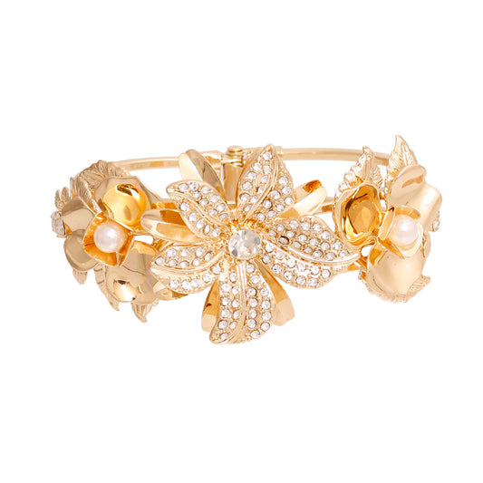 Rhinestone Floral Hinge Gold Bracelet
