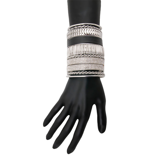 Silver Cuff with Variety of Chain Links Rhinestones and Black Vegan Leather
