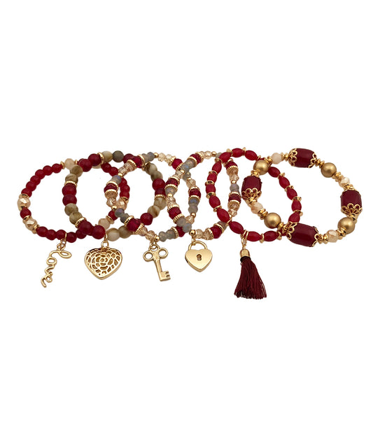 Love Charm Burgundy Bead Stretch Bracelet Set