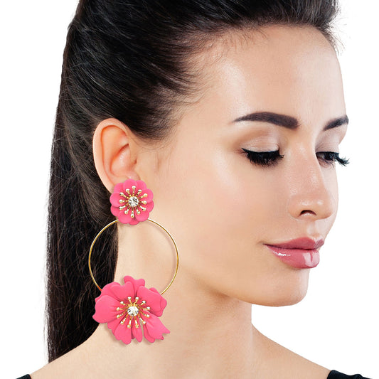 Dark Pink Coated Flower Drop Hoop Earrings