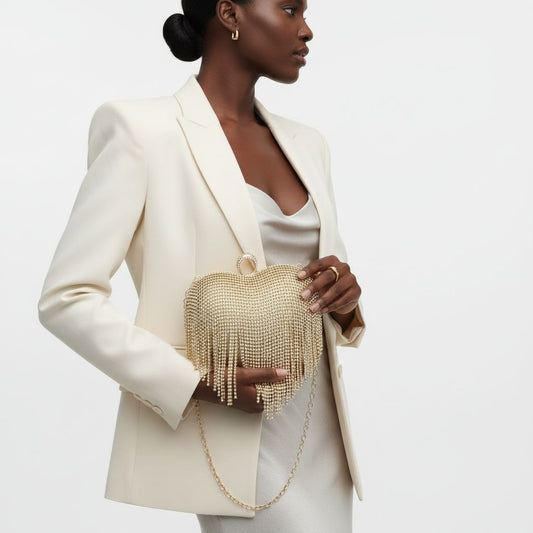 Clutch Gold Rhinestone Fringe Heart Hardcase Bag